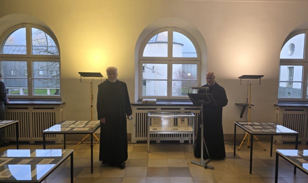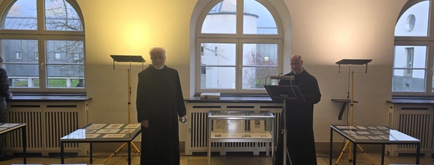 Am Sonntag, den 7. Dezember 2025, ist um 11.00 Uhr im Atrium der Klosterpforte eine besondere Ausstelluröffnet worden, die Schätze aus unserer Buch- und Kunstsammlung einem interessierten Publikum zeigt. Unter der Überschrift „Pro Felicitate – Viel Glück“ haben Abt Stephan Schröer, Frau Christine Schlering-Bertelsmeyer und Br. Anno Schütte Graphiken und Exlibris zusammengetragen, die in den 1920er Jahren als Glückwünsche zum neuen Jahr an Freunde verschickt wurden. Es handelt sich dabei um kleine Kunstwerke, die von ganz unterschiedlichen Künstlern in einer sehr bewegten Zeit gestaltet wurden. Vor den interessierten Besucherinnen und Besucher führten Abt Cosmas und Abt Stephan in das Thema der Ausstellung ein. Neujahrswünsche seien keine Erfindung von Social Media, so Abt Cosmas, sondern gehörten zum Menschsein dazu.