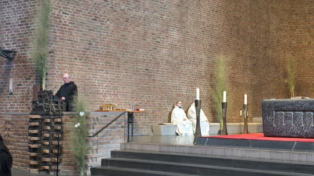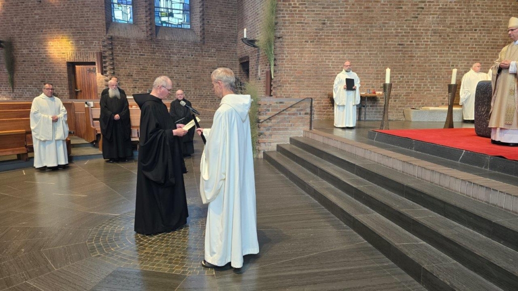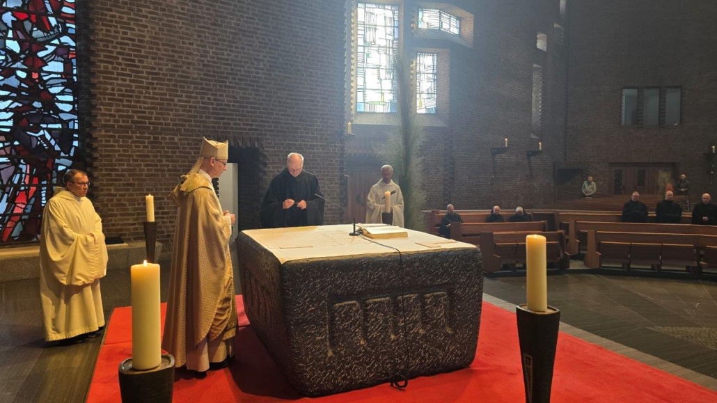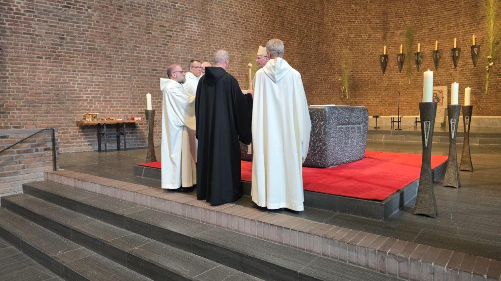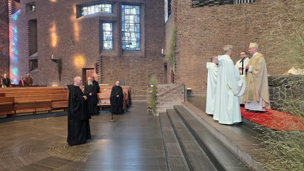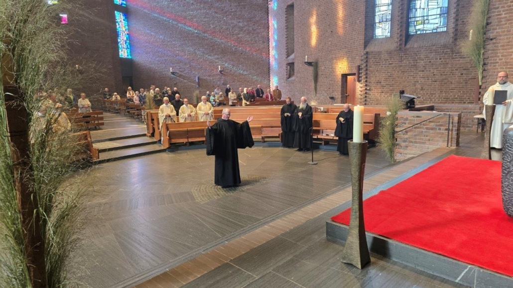 Am Sonntag, den 28.9.2025, konnten wir das Goldene Professjubiläum von P. Karl Brahm OSB feiern, der damit auf 50 Jahre Ordensleben zurückblickt. Am 26. September 1975 stand er in der Abteikirche, um vor Abt Harduin Bießle und der Gemeinschaft von Königsmünster Beständigkeit, klösterlichen Lebenswandel und Gehorsam zu geloben. Von Anfang an war es sein Traum gewesen, als Missionar tätig zu sein. Nach einer Ausbildung zum Gärtner bereitete er sich in der ihm eigenen Beharrlichkeit mit Englischkursen an der Volkshochschule darauf vor. 1988 war es dann soweit – Br. Karl wurde in die junge Abtei Inkamana im Zululand in Südafrika ausgesandt. Dort empfing er auch die Priesterweihe und war viele Jahre lang als Superior im Studienhaus Howick für die Studenten der Gemeinschaft verantwortlich. 2007 kehrte er nach Königsmünster zurück und übernahm nach einem kurzen Intermezzo an der Pforte seelsorgliche Aufgaben in der Mithilfe im heutigen Pastoralen Raum Meschede/Bestwig. In dieser Aufgabe ist er noch heute mit seinem Fahrrad, durchaus ein Markenzeichen seines Dienstes, in den Gemeinden unterwegs und übernimmt viele Gottesdienste, Taufen, Beerdigungen und viele weitere seelsorgliche Aufgaben.