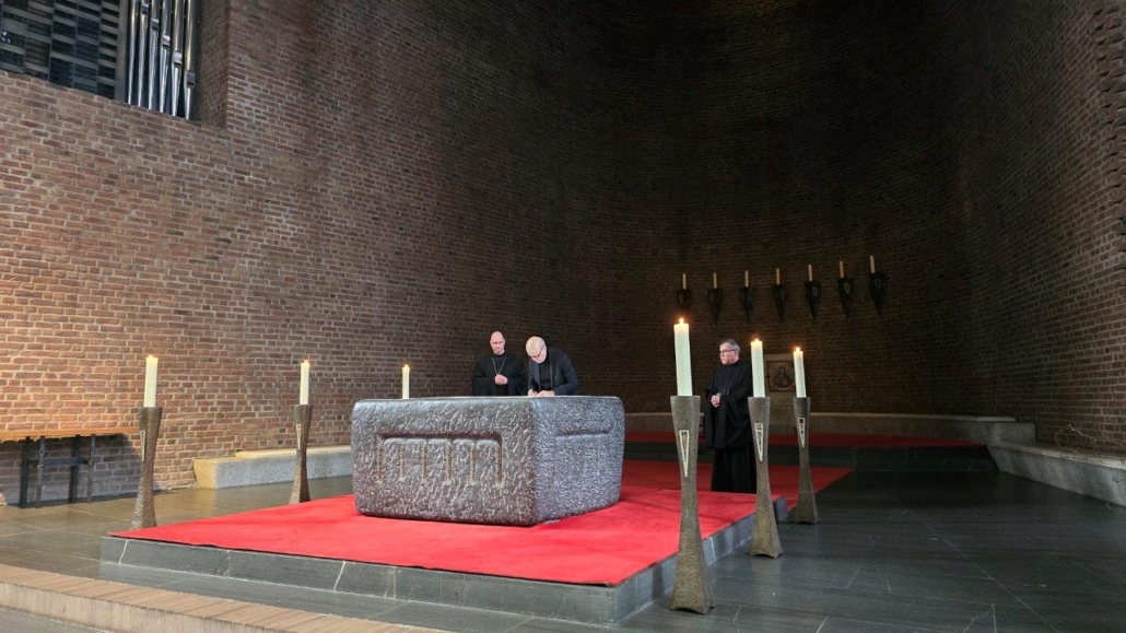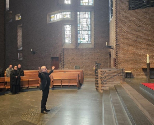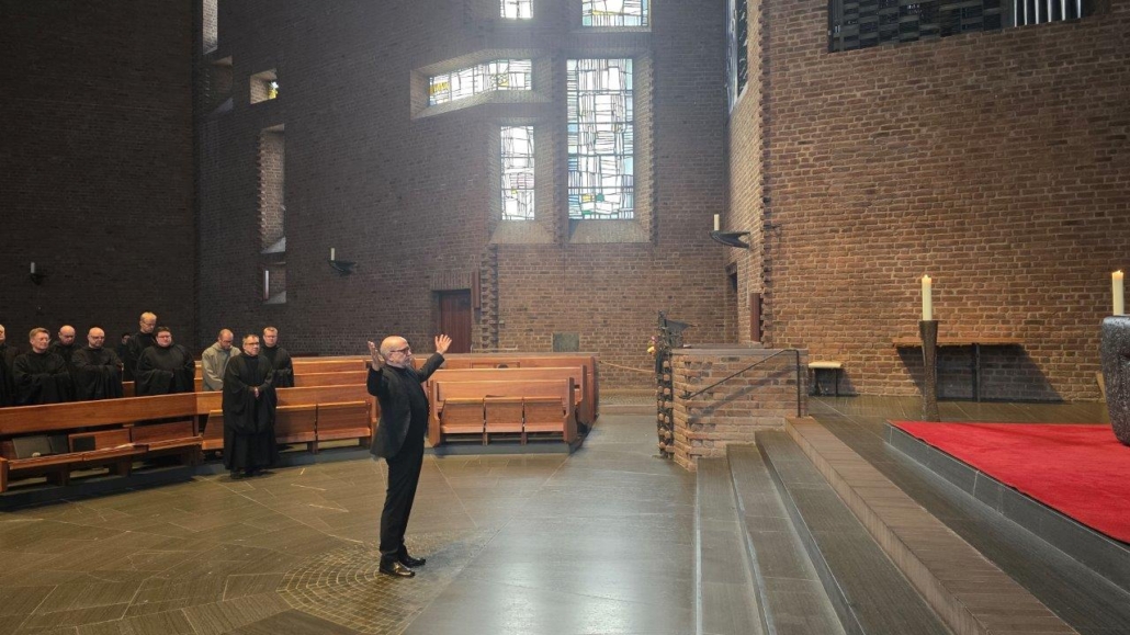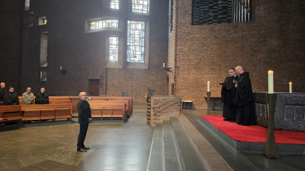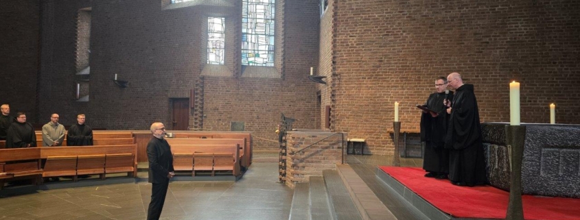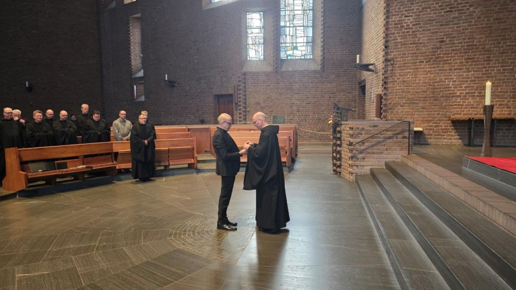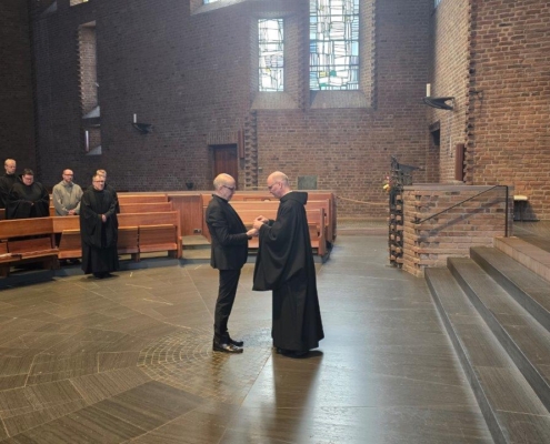 Nach dem Verlesen und Unterschreiben der Oblationsurkunde stand Herr Reier mit ausgebreiteten Händen vor dem Altar, während der Konvent den Gesang des „Suscipe“ sang, der auch während der Profess eines Mönches erklingt: „Nimm mich an, Herr, nach deinem Wort, und ich werde leben; lass mich in meiner Hoffnung nicht scheitern.“ Am Ende der kleinen Zeremonie überreichte Abt Cosmas dem Neuoblaten ein Festhaltekreuz aus unserer Abteischmiede, auf dem das Wort „Heilen“ geschrieben steht.