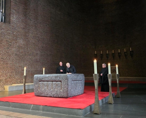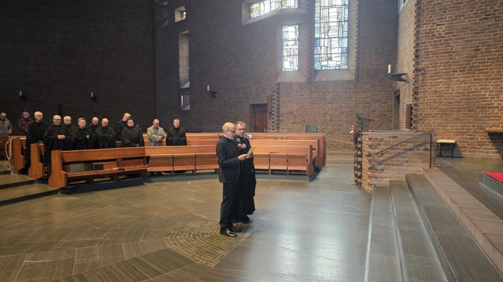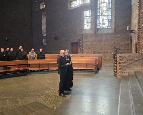 Höhepunkt des Wochenendes war die Oblation, die Aufnahme in die Oblatengemeinschaft von Herrn Wolfgang Reier in der Mittagshore am Samstag, den 22. November. Er hat die Abtei Königsmünster über mehrere Kurse im Haus der Stille kennengelernt und das benediktinische Leben schon vorher als Gast in den Klöstern Damme und Münsterschwarzach. Jeder Oblate bereichere unsere Gemeinschaft mit seinen Fähigkeiten und Kenntnissen, so Abt Cosmas in seiner Einführung, und so könne auch Herr Reier aus seiner beruflichen Tätigkeit und aufgrund vieler Fortbildungen im medizinischen und therapeutischen Bereich einen Beitrag leisten.